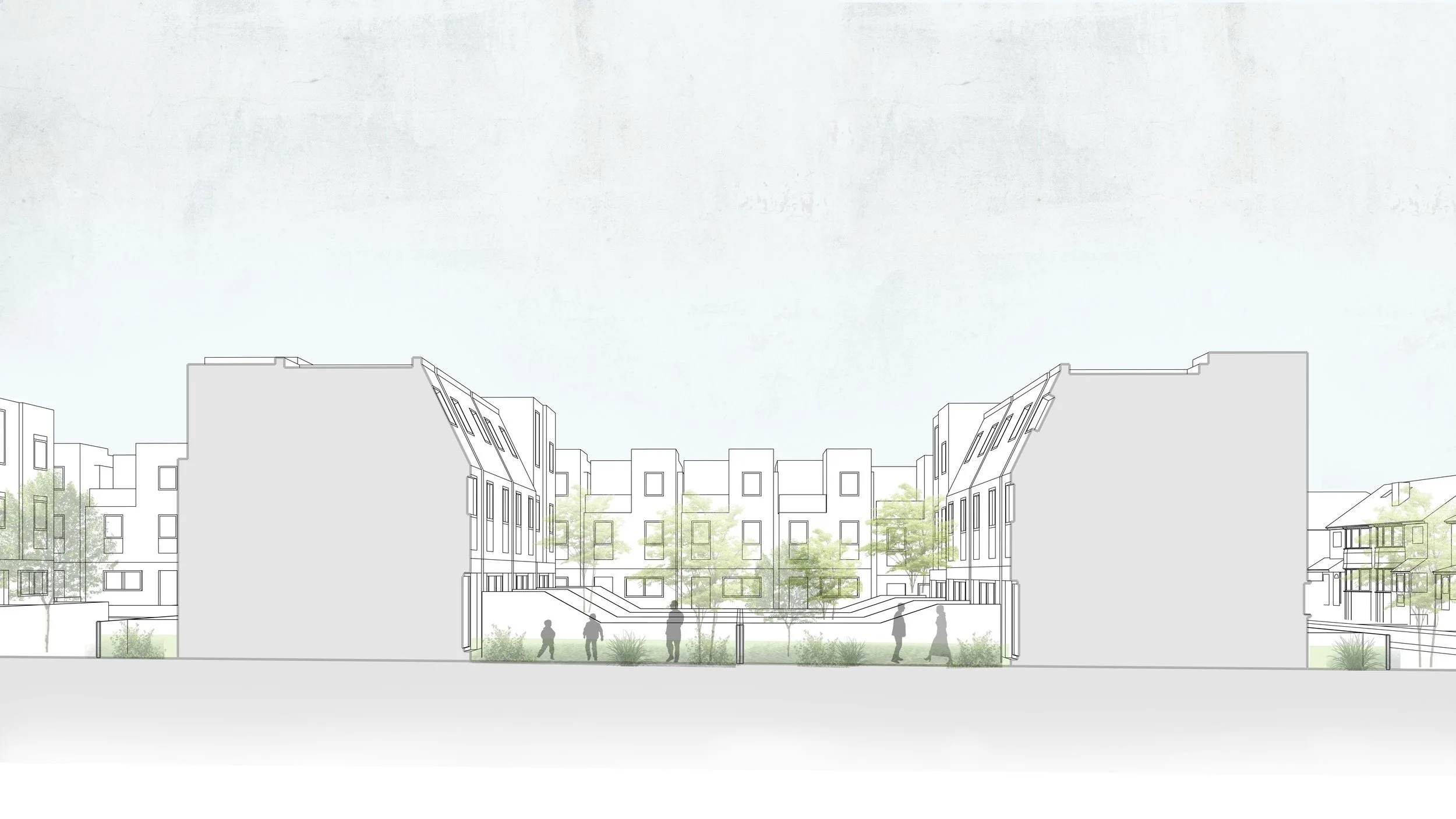 Following a Permitted Development submission for change of use from office to residential Wimshurst Pelleriti submitted the proposed scheme which includes 52 three- and four-bedroom townhouses for private sale and 34 affordable apartments in low-rise blocks.